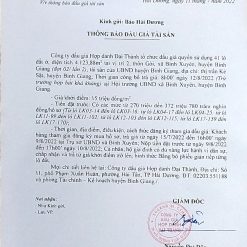 THÔNG BÁO ĐẤU GIÁ TÀI SẢN (Bằng hình thức trả giá gián tiếp từng lô) Tên, địa chỉ tổ chức đấu giá: Công ty Đấu giá Hợp danh Đại Thành, địa chỉ: Số nhà 11, phố Phạm Xuân Huân, phường Hải Tân, TP Hải Dương, tỉnh Hải Dương. Tên, địa chỉ người có tài sản: